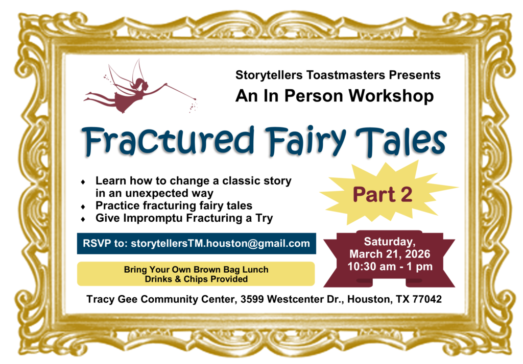 Register to attend the next Storytellers Toastmasters in person Workshop “Fractured Fairy Tales – Part 2” on Saturday, March 21st from 10:30 am to 1:00 pm at the Tracy Gee Community Center. Come prepared to learn and to practice telling fairy tales in unexpected ways. All Toastmasters and guests welcome. […]