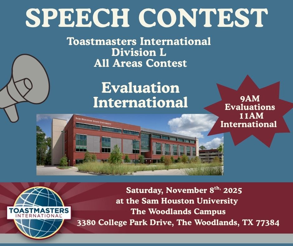 sat08nov9:00 am1:00 pmD56 DIVISION L - AREA EVALUATION & INTERNATIONAL SPEECH CONTESTS9:00 am - 1:00 pm Sam Houston University, The Woodlands Campus, 3380 College Park Drive, The Woodlands, TX 77384