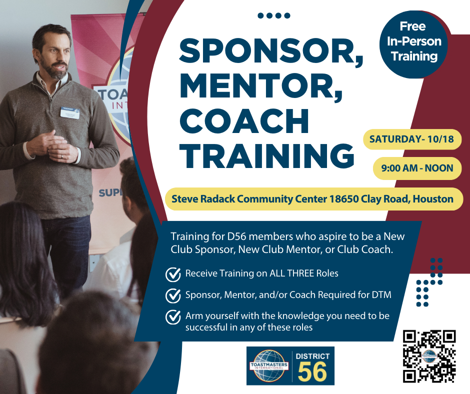 We appreciate your interest in serving as a Club Sponsor, Club Mentor, or Club Coach for District 56 Toastmasters clubs during the 2025-2026 year.